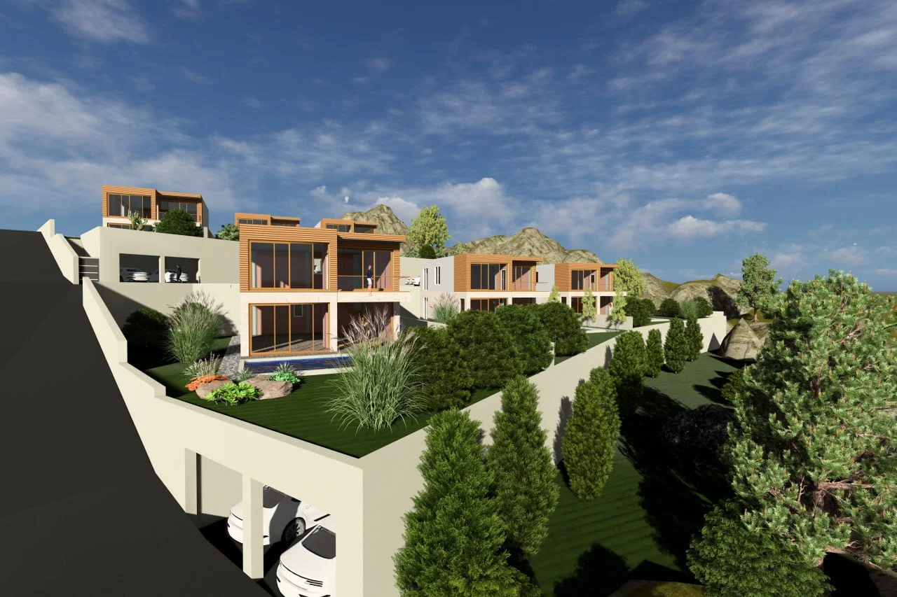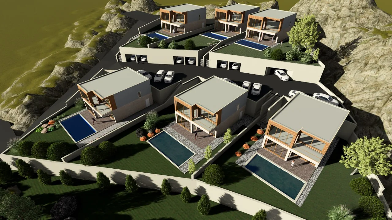 Проектом предусмотрена разработка мастер-плана коттеджного поселка в районе Тивата с панорамным видом на море. Основной задачей стало рациональное и бережное освоение участка со сложным рельефом при сохранении природного ландшафта и уникальных видовых характеристик.
