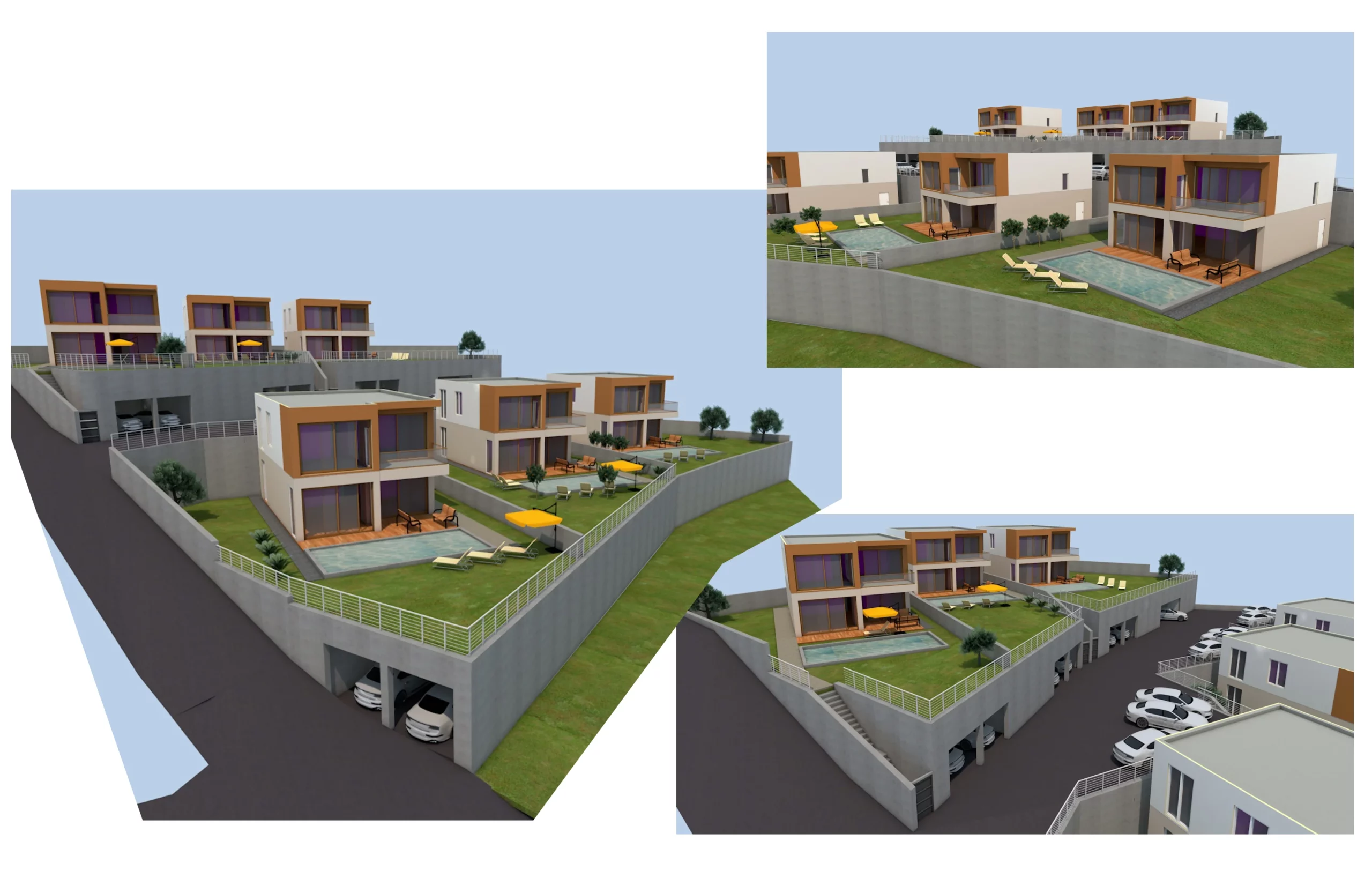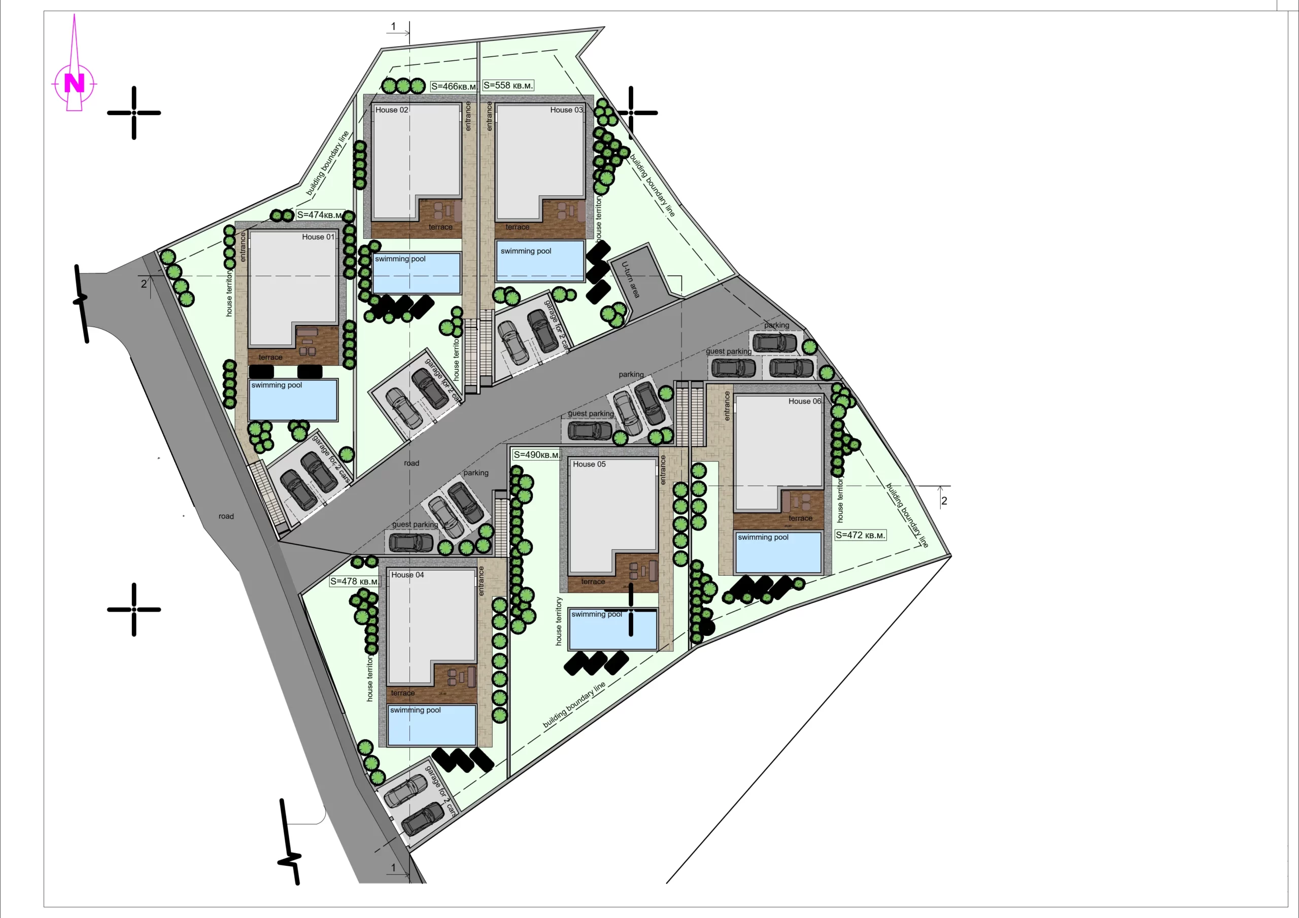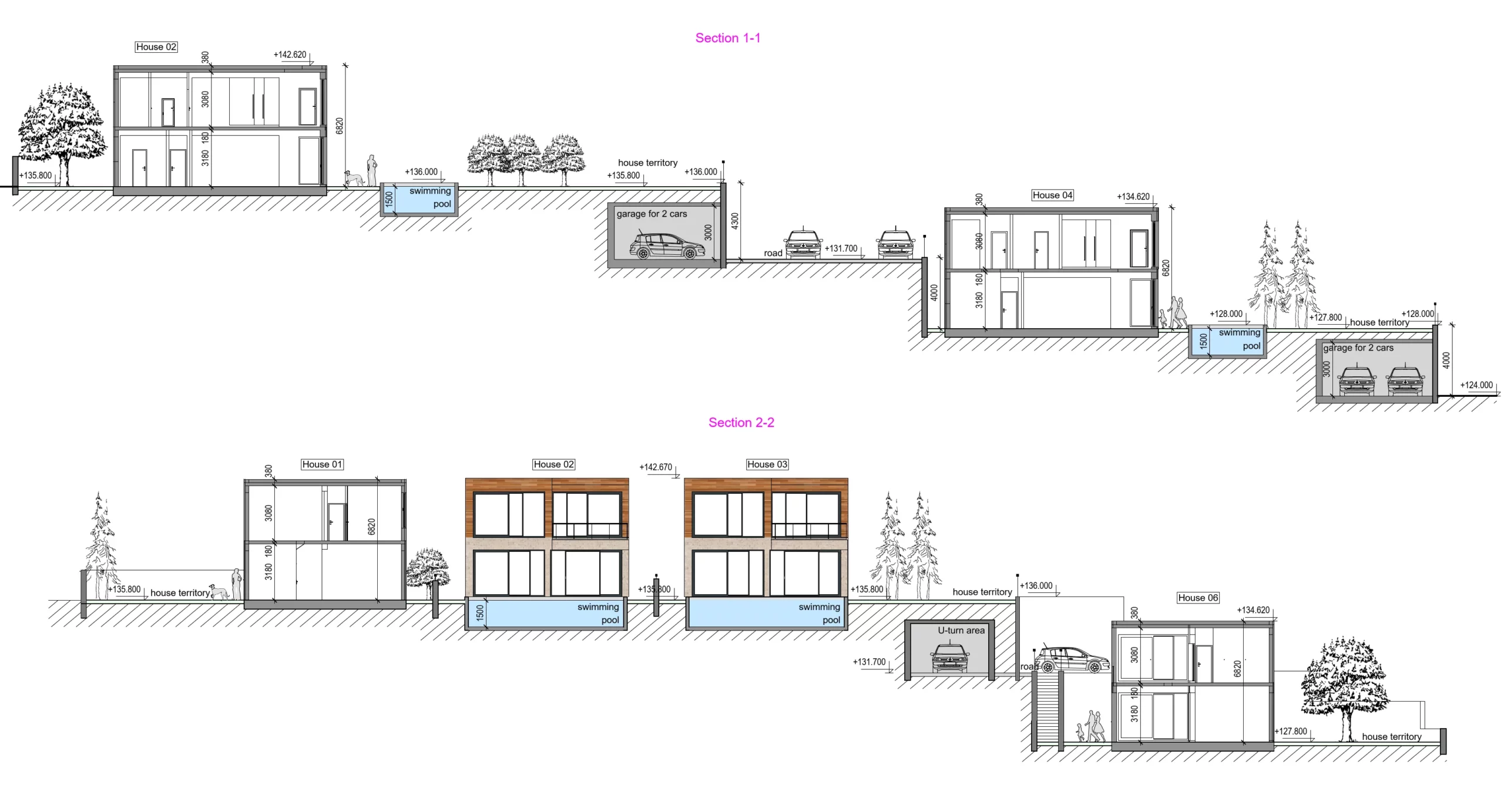 Для каждого дома предусмотрены два парковочных места либо гараж на две машины, а также индивидуальный бассейн, интегрированный в структуру участка с учетом ориентации и видовых точек.