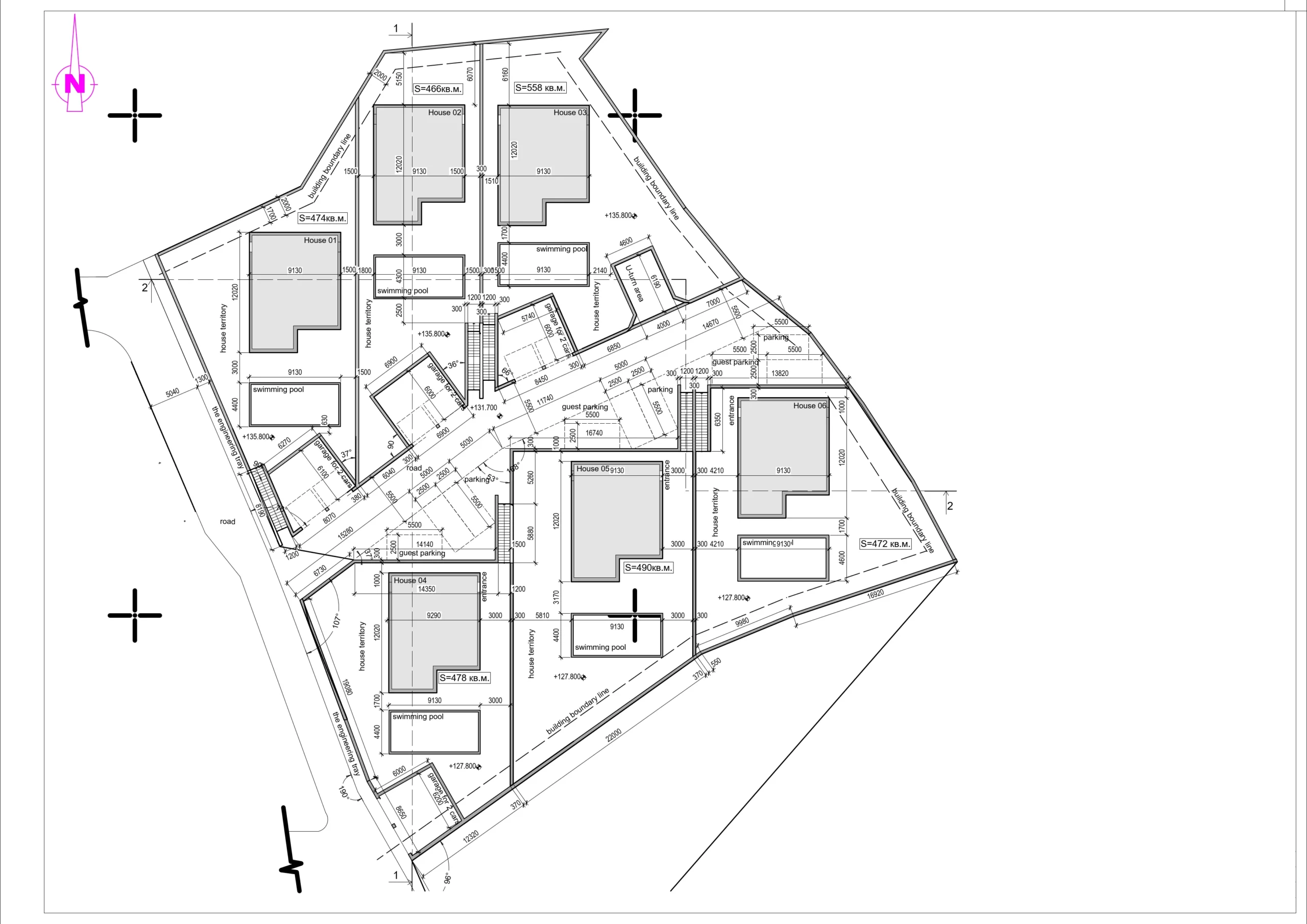 Территория равномерно разделена на шесть самостоятельных участков, на каждом из которых размещен индивидуальный жилой дом единой архитектурной концепции. При проектировании учтен значительный перепад рельефа — около 12 метров, что потребовало продуманной террасной организации застройки и грамотного размещения зданий с соблюдением нормативных расстояний между ними.