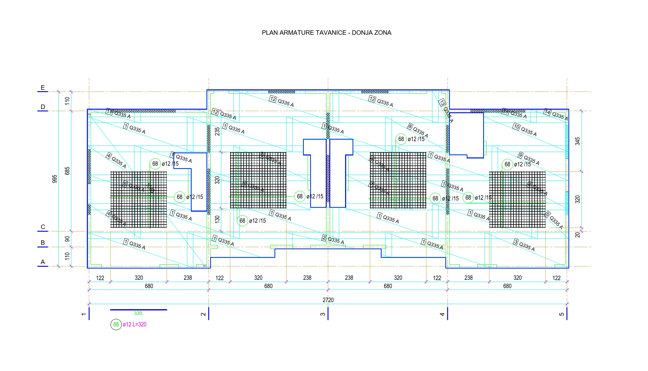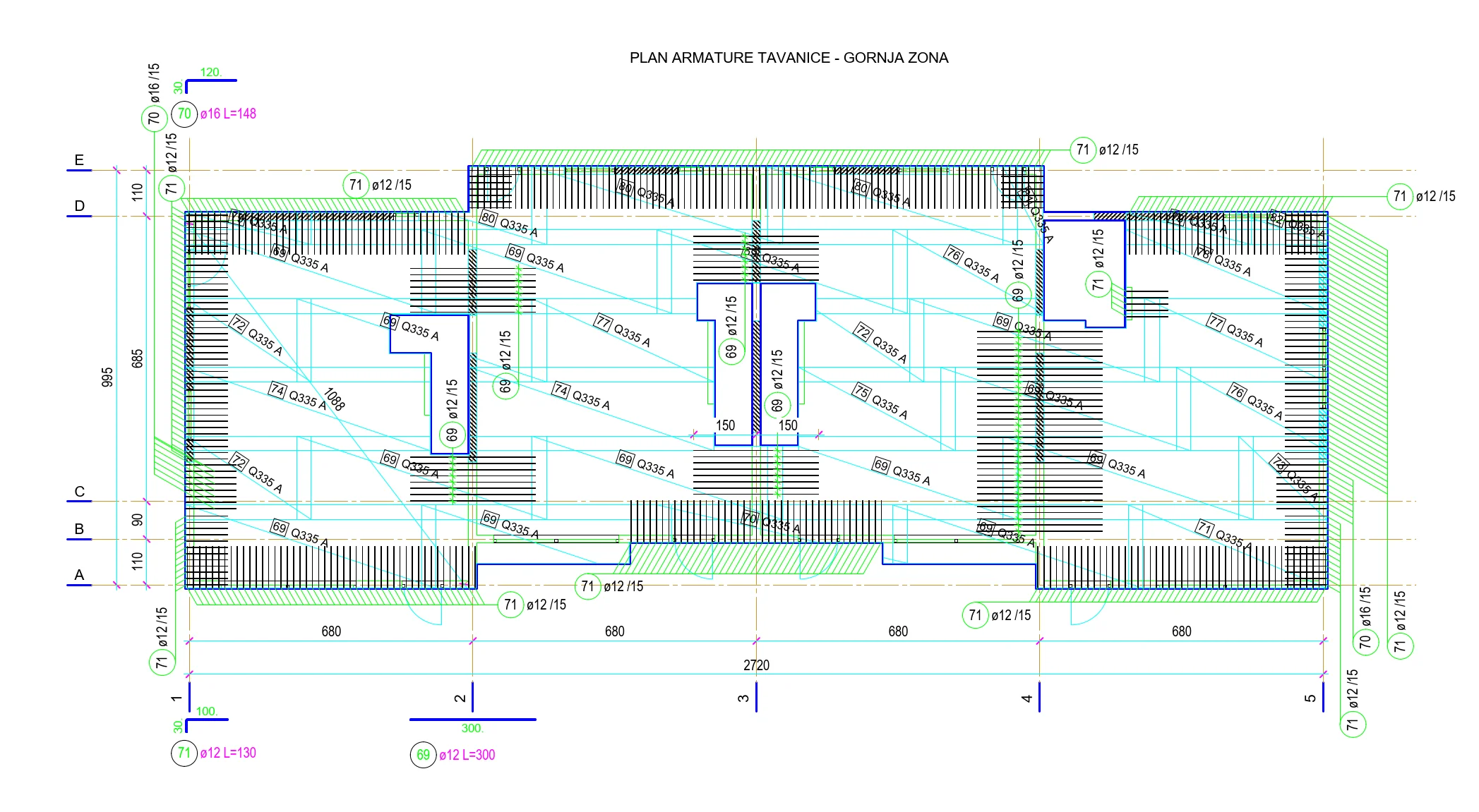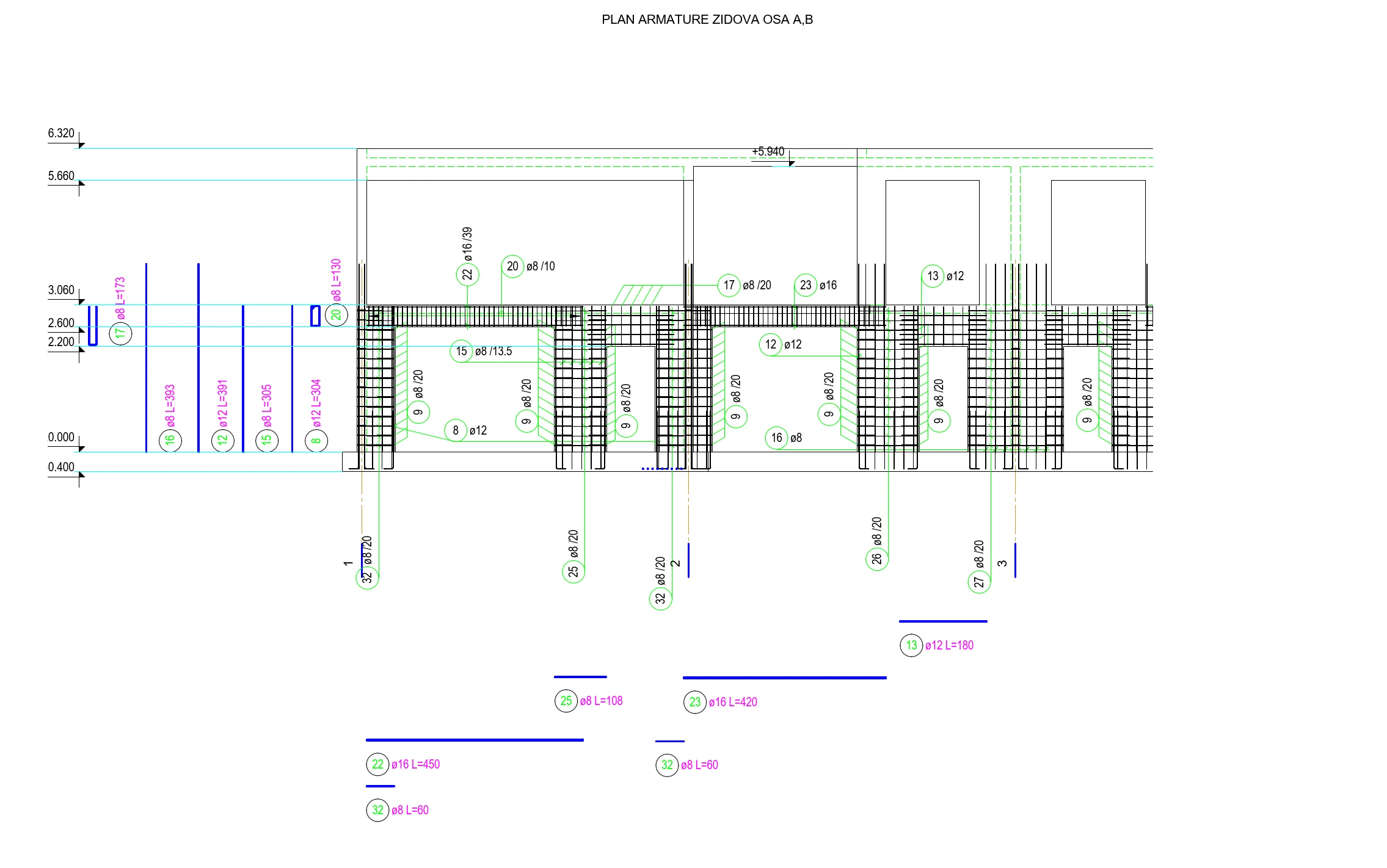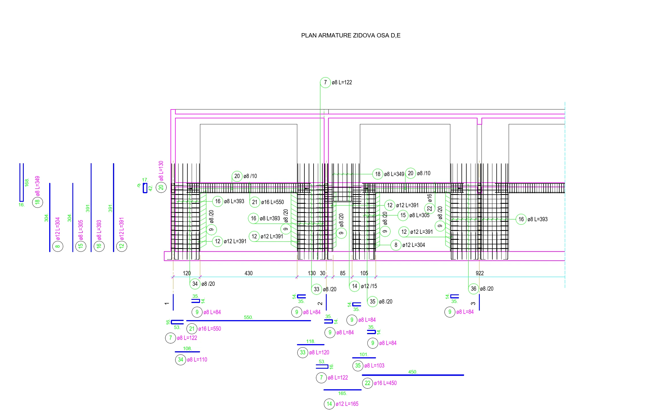 Задача проекта заключалась в разработке раздела конструктивных решений для уже существующих архитектурных планировок. Были выполнены планы расположения несущих конструкций, а также детальные решения по армированию стен, колонн, балок и плит перекрытия.